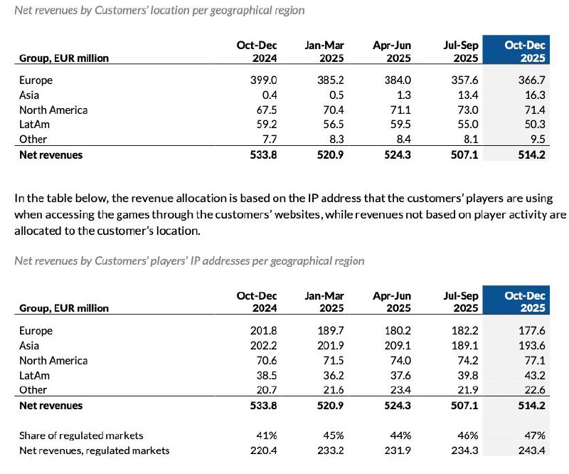 Net revenues by Customers’ location per geographical region — выручка в разбивке по гео на основе неигровых параметров, а «гео-оператора», вероятно речь идёт о стране операционной компании, либо лицензии.