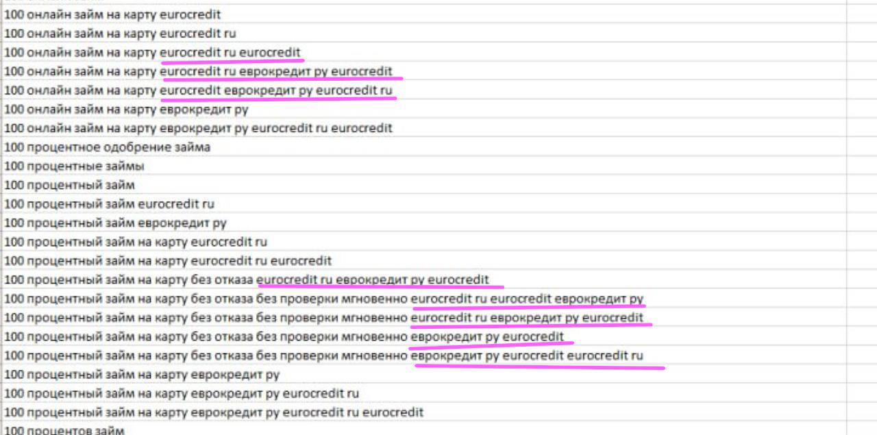 Получаются формулировки типа: «займ еврокредит ру еврокредит еврокредит». Клики льют именно туда, а не по чистым коммерческим ключам.