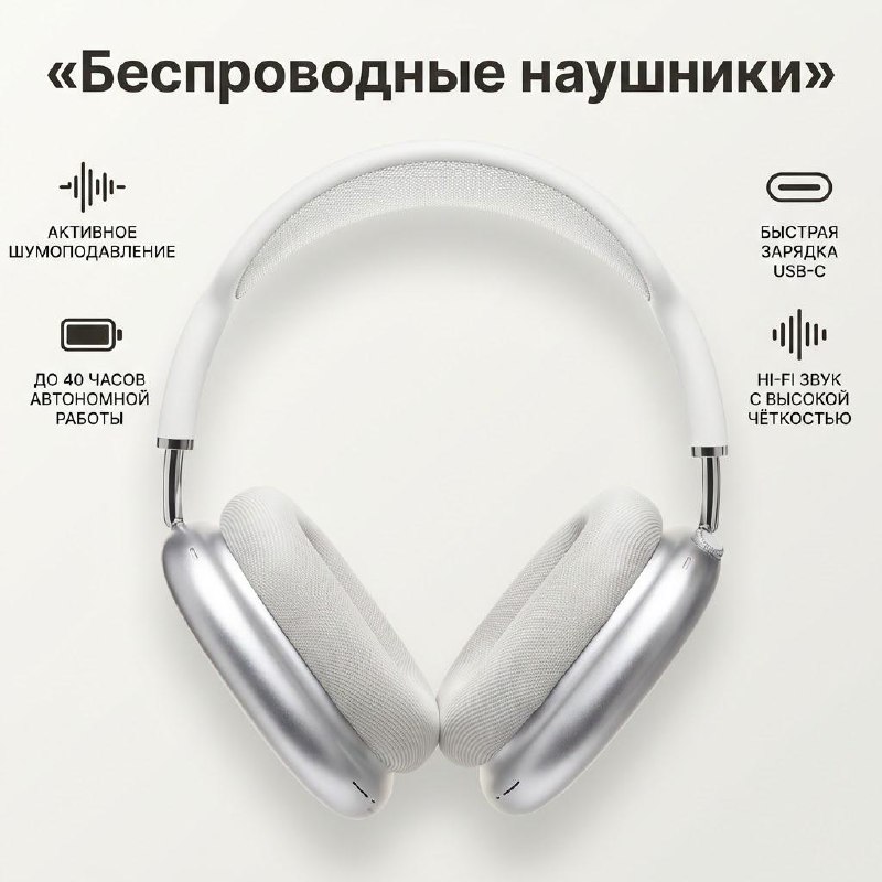Карточка продукта. В центре — [Беспроводные наушники], крупный детализированный план с акцентом на материалы и сборку. Чистая студийная съёмка премиум‑уровня. Фон — нейтральный, минималистичный, с мягким градиентом для глубины. Композиция выверенная и симметричная: продукт в фокусе, по бокам — понятная инфографика с иконками преимуществ. 4 ключевых преимущества: «АКТИВНОЕ ШУМОПОДАВЛЕНИЕ», «ДО 40 ЧАСОВ АВТОНОМНОЙ РАБОТЫ», «БЫСТРАЯ ЗАРЯДКА USB‑C», «HI‑FI ЗВУК С ВЫСОКОЙ ЧЁТКОСТЬЮ». Вве…