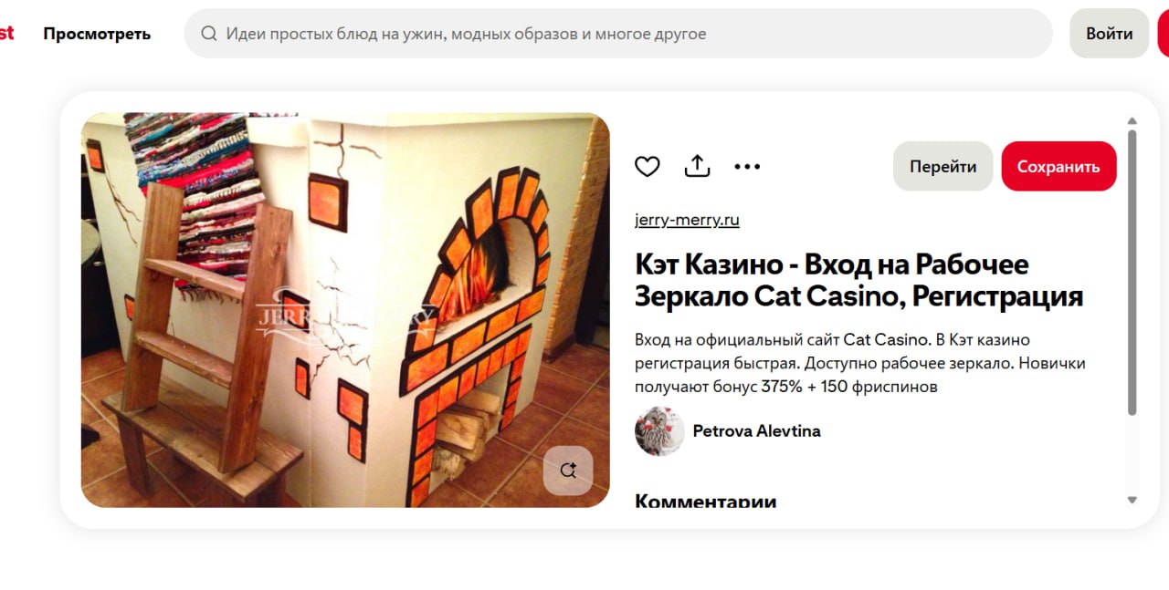 Казиношный пин в акке про искусство и одежду (на самом деле — рандомные картинки) был в топ-5 по «cat casino зеркало» в RU.