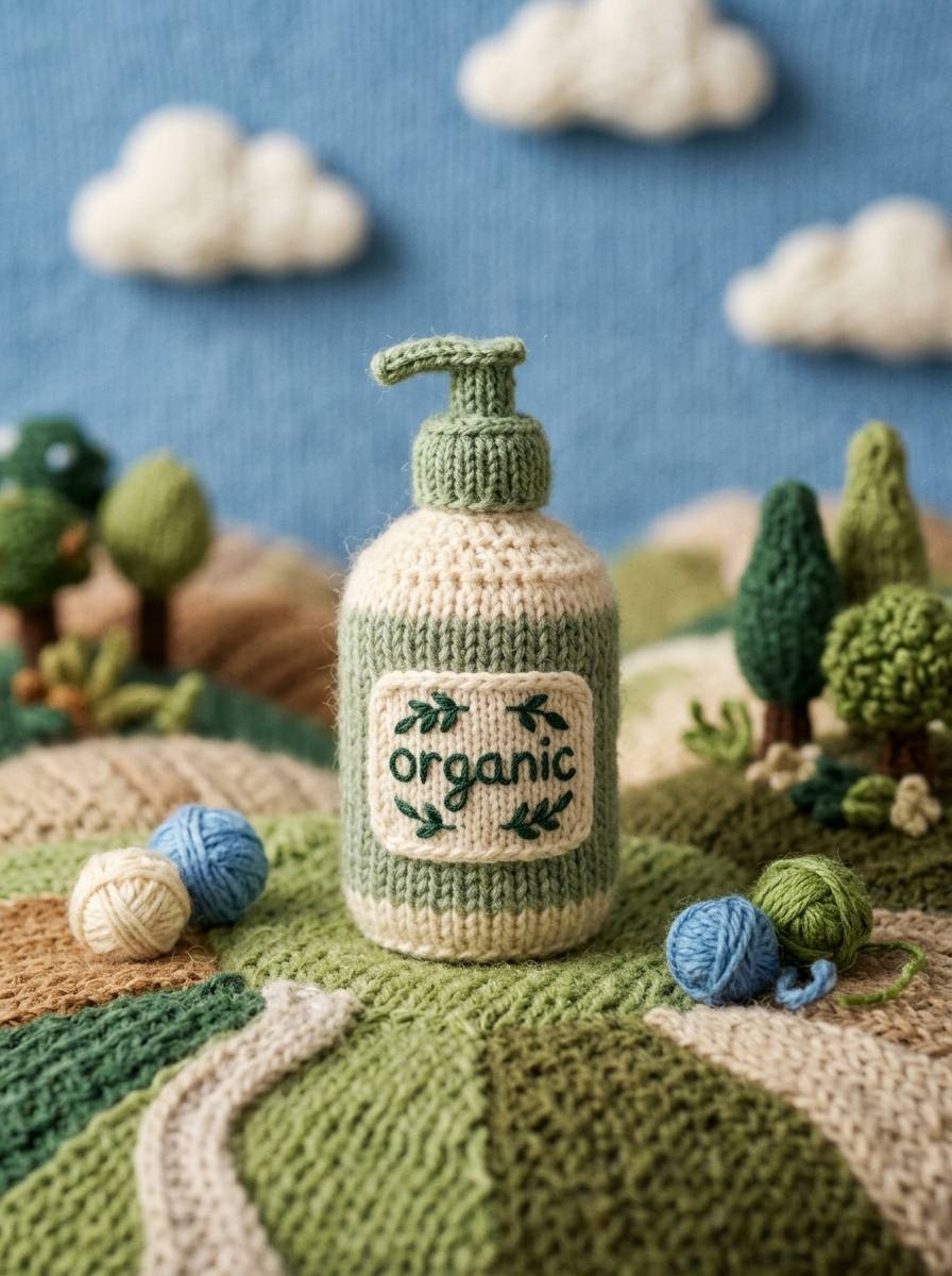 a knitted [PRODUCT] made of soft wool yarn, handcrafted miniature textile world, embroidered [PRODUCT CATEGORY] label on the packaging, crochet stitches covering the surface, surrounded by yarn balls and knitted landscape fields, tiny wool trees and hills, fluffy knitted clouds floating in a blue sky, macro lens photography, shallow depth of field, soft daylight, cozy stop-motion animation style, extremely detailed wool texture, cute handcrafted aesthetic